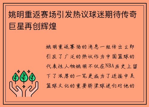 本文将对中国篮球巨星姚明的身材特点与运动表现进行深入分析,并探讨他是否真的显得笨重。姚明以其超过两米的身高和超凡的篮球技巧而闻名,但与此同时,他的体型也常常引发外界对其灵活性与敏捷性的质疑。文章将从姚明的生理结构、运动能力、战术运用以及职业生涯影响四个方面来详细解读,旨在揭示姚明在球场上的表现是否受限于他的身材特征。通过这样的分析,希望能够更全面地理解这位杰出运动员所展现出来的独特魅力。 1、姚...