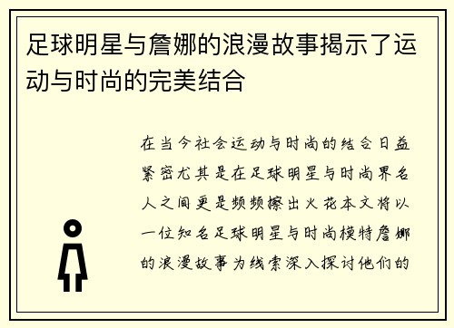 在当今社会,广告的形式与内容日益多样化,其中以足球为背景的广告尤为引人注目。足球不仅是一项全球受欢迎的运动,更是许多品牌展示自我的绝佳舞台。本篇文章将围绕“广告化身足球明星在绿茵场上展现精彩踢球瞬间”这一主题,从多个角度分析这一现象。首先,我们将探讨如何通过生动的视觉效果和情感共鸣吸引观众,其次,讨论明星效应对品牌形象的提升,再者,分析足球文化与广告结合所带来的社会影响,最后,评估未来发展趋势及其...